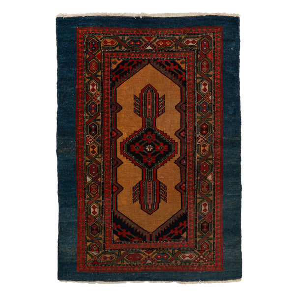 Characterized by its lozenge-shaped medallion design, this Multicolored Antique Serab Persian Rug - 3'1" x 4'3" originates from a smaller village located near the trading hub of Heriz in Persia. The intricate and elongated medallion center is accented with multiple geometric borders and closed with a perfectly balanced solid blue edge. The geometric designs featured in this one-of-a-kind rug are unique to the Serab village weavers due to its nomadic people and limited influence from outside traders and weavers. Finished...