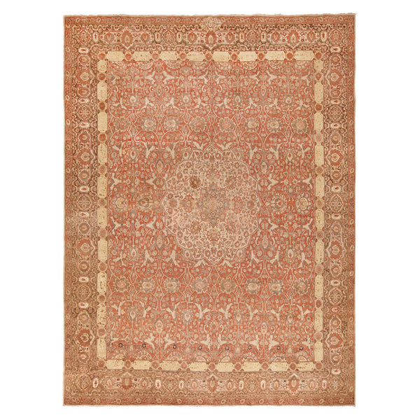 This Red Antique Traditional Persian Tabriz Rug measures 10'6" x 14'4", suitable for larger living spaces. Originating from Iran, this piece is a product of traditional Persian rug weaving. It features hand-knotted wool construction, crafted using established methods. The rug displays a field of muted red, exhibiting terracotta and subtle burnt orange hues. This central area is patterned with a detailed traditional Persian design, including a prominent central medallion. Intricate floral motifs, such as palmettes, scrolling vines, and blossoms, are...