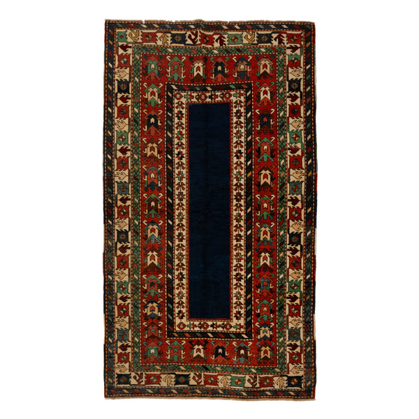 This traditional hand-knotted Seychour wool rug measures 3 feet by 4 feet 7 inches, providing a distinct accent for various spaces. Crafted from durable wool, this rug is sourced from Russia and showcases a multi-color palette featuring prominent blue and red tones, complemented by cream, green, and dark accents. The rug's design centers on a deep navy blue field, which serves as a visual focal point. This central area is framed by a series of borders. An inner border features...