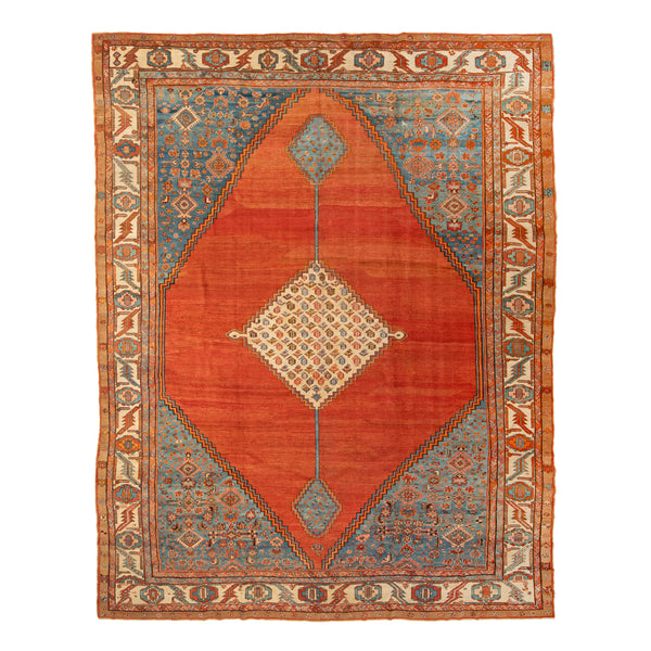 This antique Red Traditional Bakhshayesh Wool Rug, measuring 11'7" x 14', is a hand-knotted piece originating from Iran. It offers a substantial presence suitable for various large interior spaces. The rug's design features a prominent red central field. Within this field, a large, intricate diamond-shaped medallion defines the rug's core. This central medallion is bordered with detailed patterns and contains a smaller, complex diamond motif rendered in cream and subtle blue tones. Complementing the central design, the corners are filled...