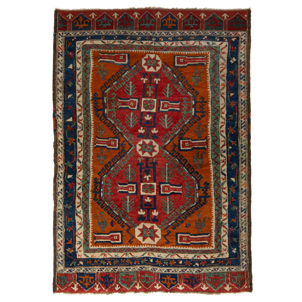 This antique Turkish rug is a hand-knotted wool piece, measuring 5 feet in width and 7 feet 5 inches in length. Originating from Turkey, it reflects traditional Anatolian textile artistry and construction. The rug features a dominant red central field containing two prominent, layered geometric medallions. These medallions are surrounded by an expansive orange secondary field. This central design is framed by a multi-layered border system, which includes bands of deep navy blue and a contrasting cream. The overall color...