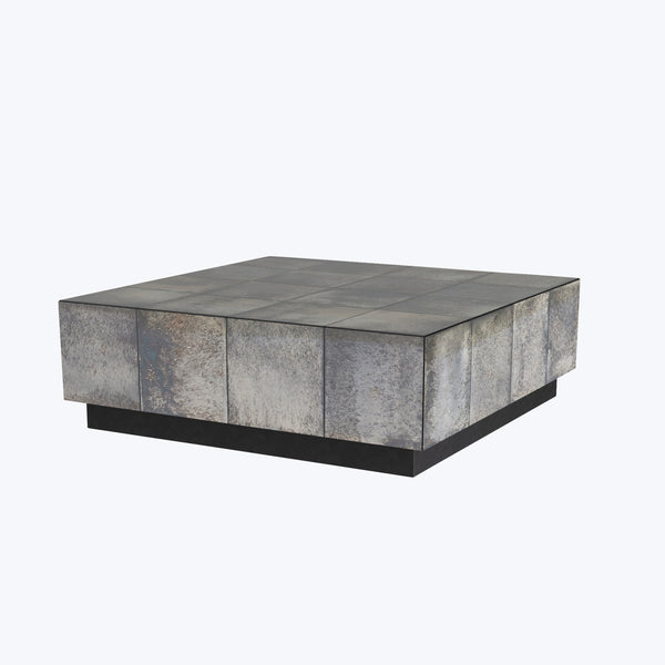 The vintage allure of watercolor design inspired the finish of our antiqued-finished coffee table. The top and sides are wrapped around in a grid pattern floating on a bronzed iron base. Antiquing willv vary.