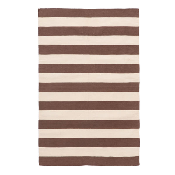 This hand-woven flatweave cotton rug, with its 3'6" by 5'6" dimensions, unfolds a quiet narrative of elegance through its alternating brown and off-white stripes. The design whispers versatility, ready to slip seamlessly into modern minimalist abodes, classic settings, or the rustic charm of farmhouse decor. Made entirely from soft, natural cotton, it delivers a comforting touch underfoot while standing up to the demands of everyday life. Reflecting the traditional Kilim style, this rug skips the pile, settling into a low-profile...