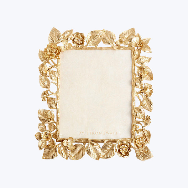 Cast in gleaming 18K gold, this intricate picture frame provides the perfect backdrop for your favorite 8" x 10" photograph. Look and you’ll find opulent stargazer lilies, orchids and other lush tropical flora among the vines and leaves. A divine work of art all its own, this frame is sure to make a statement. Pewter with a 18K gold hand polished finish with light brown antiquing. Handcrafted in Rhode Island.