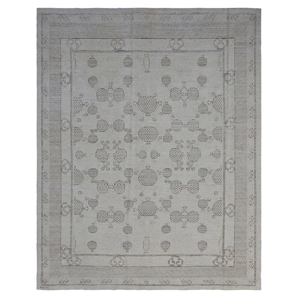 This hand-knotted Grey Traditional Wool Rug offers a refined addition to any interior space. Crafted from durable wool in Turkey, this area rug measures 7 feet 7 inches wide by 9 feet 7 inches long, providing substantial coverage for various room layouts. The design features a light grey field with a repeating pattern of stylized fruit-like motifs, including pomegranates and traditional vase elements, rendered in a contrasting darker grey. This two-tone grey palette creates a subtle visual texture. The central...