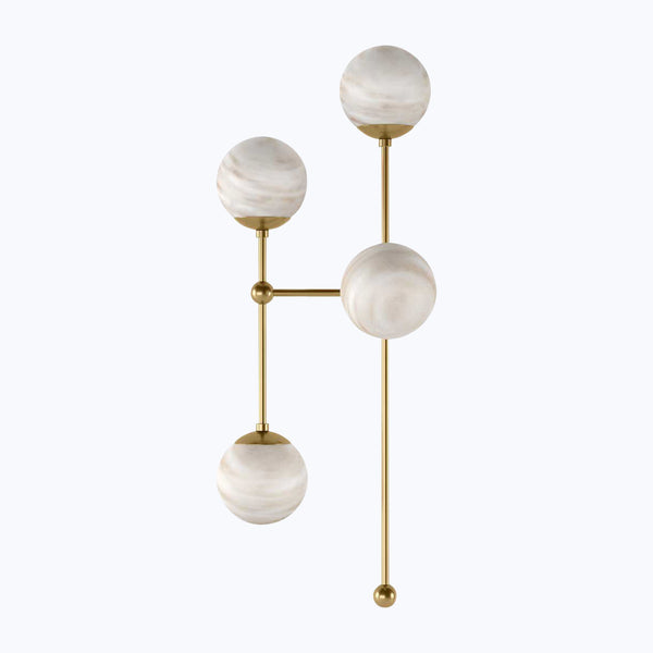 Discover the Armstrong 4 Sconce by Four Hands. Featuring exquisite symmetry and beautiful marbled glass spheres, this eye-catching sconce blends art deco elegance with modern sophistication. Each globe is handblown, shaped, and sculpted in an hour-long process. Designed and sustainably crafted in Poland by Schwung. Available in black gunmetal and burnished brass. Choose from left and right configurations.