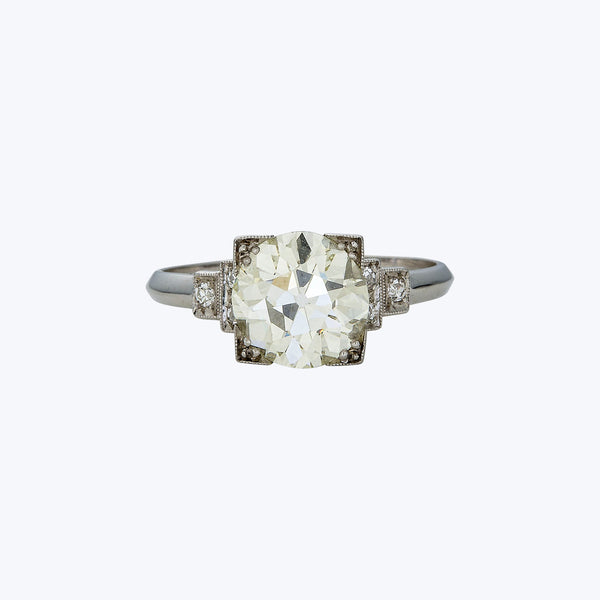 Back in the Art Deco era when it was popular to make round stones appear more geometric, illusion settings were very popular. Its a style that has stood the test of time - it's incredible in its simplicity and charm. Set with a very white facing 2.24ct old European cut diamond with a killer make and faceting, the ring is a stunner on the finger, as it twinkles on and off with every movement. Art Deco Platinum 2.23 ct. OEC...
