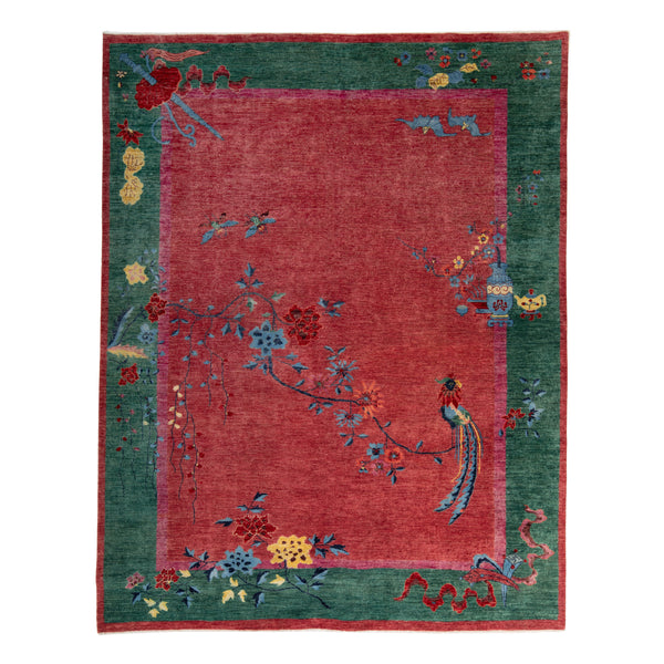 Add a touch of elegance to your space with this Multi Traditional Art Deco Rug - 8'1" x 10'3". This traditional rug from Pakistan showcases a complex and colorful design. With a deep red central field and a wide green border, its slightly faded look adds a sense of history. The intricate floral pattern features various flowers, vines, and a bird design, bringing life to the rug. Expertly hand-knotted from wool, this high-end rug is perfect for adding a decorative...
