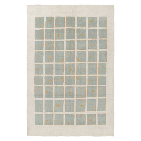 This Blue and Cream Contemporary Scandinavian Wool rug showcases a striking geometric pattern in shades of blue with subtle gold accents. Hand-woven in India from high-quality wool, this 6'1" x 8'11" rug exudes modern elegance and is perfect for adding a touch of sophistication to any space.