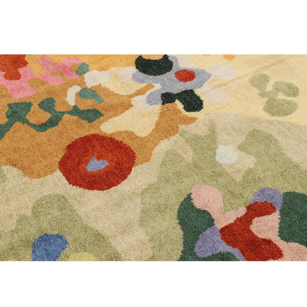 This Multicolored Contemporary Art Deco Wool Cotton Blend rug, measuring 5'5" x 6'7", features an abstract design in vibrant shades of orange, red, blue, green, and pink against a light neutral background. Hand-woven in India, this plush rug offers a high-quality blend of wool and cotton for a luxurious feel and modern aesthetic.