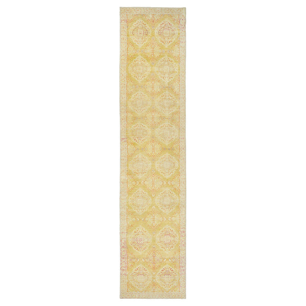 A 6’3” x 27’3” stretch of sumptuous wool beckons with its inviting hue and intricate artistry, casting a glow of warmth across even the most cavernous of hallways or grand entryways. This yellow traditional runner isn't just a rug; it’s a declaration of classic elegance that commands attention through its sheer scale and craftsmanship. Its vibrant color palette—the sun-drenched yellow canvas kissed with whispers of cream—sets the stage for a dance of traditional patterns. Amidst these, subtle, faded notes of...