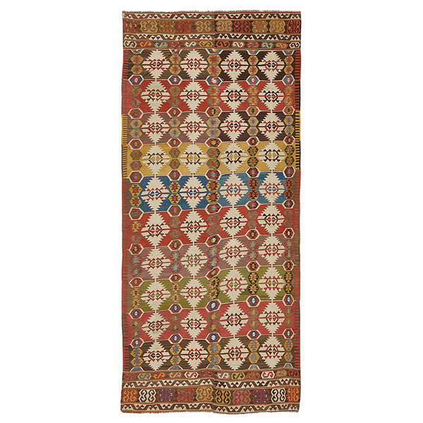 A feast for the eyes unfolds on the floor with this hand-woven wool rug from Turkey, where craftsmanship and artistry intertwine in a dance of colors and patterns. Measuring an impressive 5 feet by 11 feet 8 inches, it stretches out like a canvas displaying the rich artistry of Anatolian heritage. Deep reds, earthy browns, and vibrant blues play against warm golden yellows and olive greens, all resting on a bed of natural cream. The geometric patterns, arranged into columns...