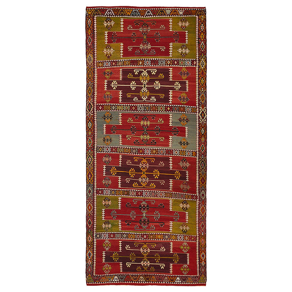 A deep, captivating red draws you in with this vintage wool Kilim rug from Turkey. Every inch of its 6'1" by 16'6" expanse speaks of history. Ideal for transforming long hallways or open living areas, it commands attention not just with its size, but with its sheer artistry. This isn't just any rug; it's a story woven from natural wool, a testament to resilience and warmth underfoot. The color palette, a symphony of reds from deep crimson to warming tones,...