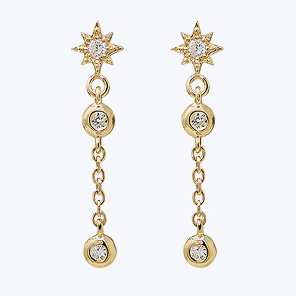 A white diamond centered starburst is delicately mounted on a gold post alongside diamond bezel set cascade chains. *Sold as a pair