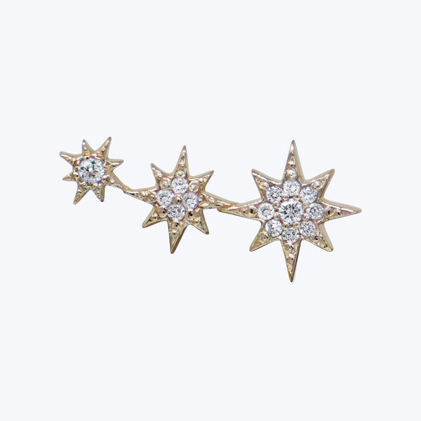 Three pavé set diamond star studs are soldered together and mounted on posts to create a shimmering and whimsical ear crawler inspired by the North Star. *Stud sold individually Bar total width is approximately 17mm wide longest point is approximately 7" on largest star