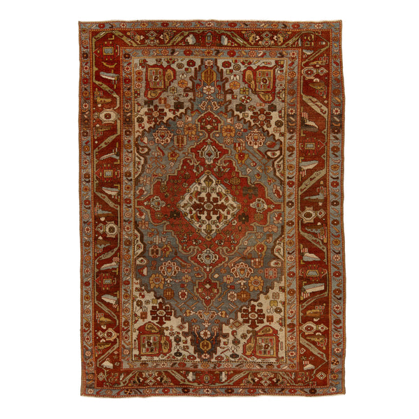 This vintage hand-knotted Bakhtiar rug measures 7 feet 1 inch by 9 feet 10 inches, presenting a traditional design suitable for various interiors. Crafted from natural wool, the rug features a hand-knotted construction. This traditional method contributes to the rug's durability and unique texture, showcasing artisanal quality. The rug displays a primary color palette of deep red, muted blue-grey, and cream, accented with touches of gold and brown. Its design centers around a multi-layered medallion, detailed with floral and geometric...