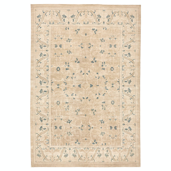 This classic Bamyan wool rug features a delicate Persian-inspired pattern in faded teal hues on a pearly cream ground. Providing a view of the arid landscape of Bamyan, a region in Afghanistan known for its carved sandstone cliffs and deep blue lakes, this rug lends an airy effect to a traditional interior.
