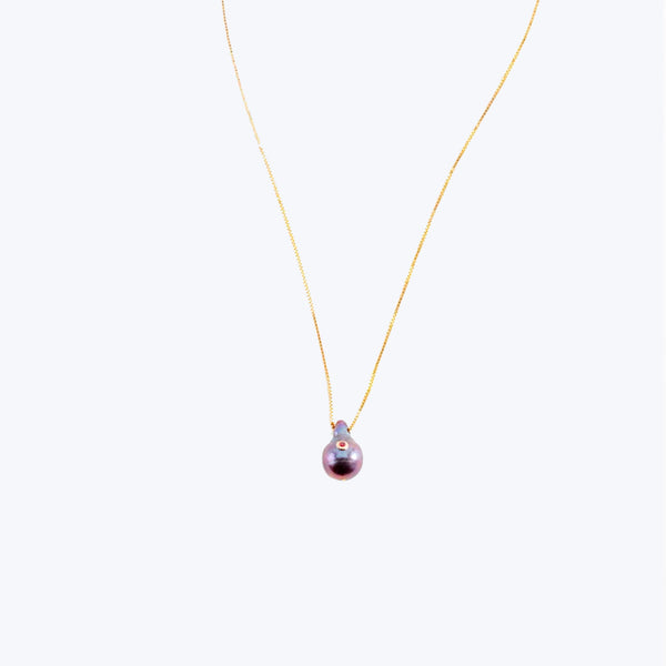 Possessing a timeless beauty, this necklace features a lustrous Baroque black pearl inlaid with a pair of rubies, strung upon a delicate 14k yellow gold box chain.
