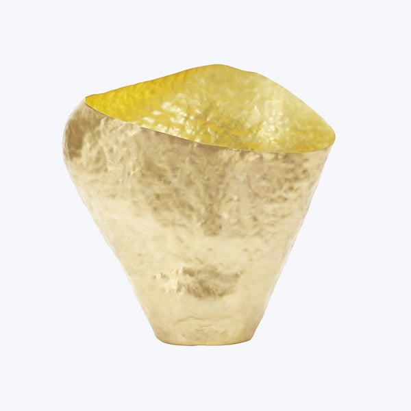 Appropriately named, Bash vessels are formed from a single brass sheet and hammered into shape by hand, creating an expressive crumpled form in a lavish polished gold. Each Bash vessel will have a unique form due to the handmade nature of its creation. Presented in gift-worthy packaging, this gold decorative vase serves as an exquisite flower vase, fruit bowl, or contemporary sculpture. Layer your mantel, dresser, or table in luxury with the Bash Polished Gold Brass Vase Vessel - Wide.