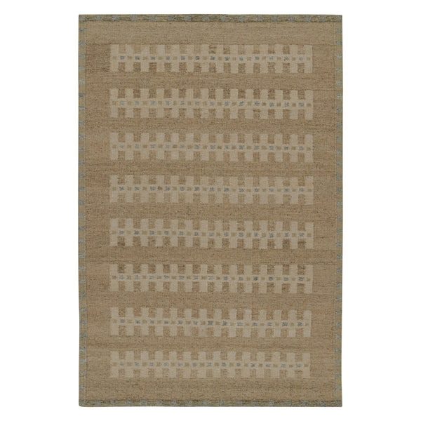 This Beige Swedish Inspired Wool Flatweave rug measures 6'2" x 9' and features a geometric pattern in earthy tones of beige and light brown. Hand woven in India from 100% wool, this high-quality rug offers a luxurious texture and exquisite craftsmanship. A beautiful addition to any home decor.