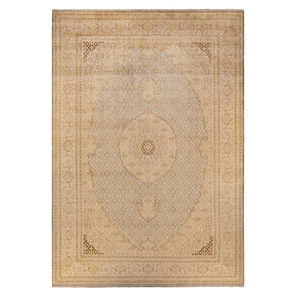 This large beige traditional Mogul wool rug measures 10' x 14'5", providing extensive coverage for various room sizes. It features a classic central medallion design, surrounded by intricate floral and geometric patterns that extend across the field and into the multi-layered border. The overall design reflects traditional Mogul aesthetic principles. Constructed from wool, this rug is hand-knotted in Pakistan, highlighting its traditional craftsmanship. The wool material offers a soft texture underfoot while providing durability for daily use. The beige color...