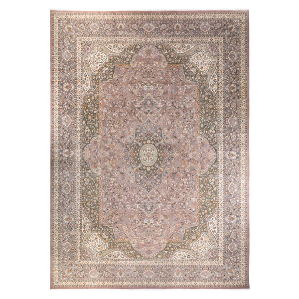 This hand-knotted traditional wool rug measures 12 feet by 17 feet 9 inches, providing a substantial floor covering for large interior spaces. Crafted from natural wool, this rug combines a classic aesthetic with durable construction, suitable for long-term placement in various home environments. The rug features a central medallion design, a hallmark of traditional rug patterns. Its field is intricately detailed with an array of floral motifs and vine work, presented in a complex color palette that includes muted beige,...