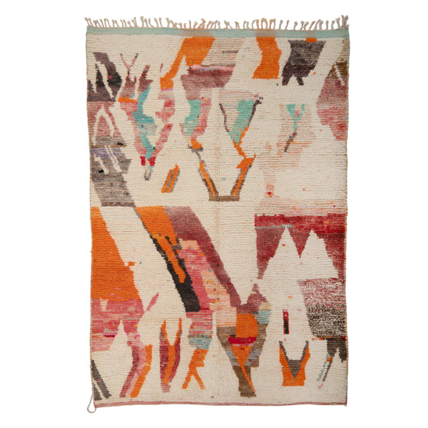 This Multicolored Moroccan Berber Wool Rug - 6'9" x 9'8" features a vibrant abstract design with shapes and lines in varying shades of orange, brown, red, blue, beige, pink and black. Its dynamic tapestry exudes artistic flair and craftsmanship, making it perfect for adding color and intrigue to any space.
