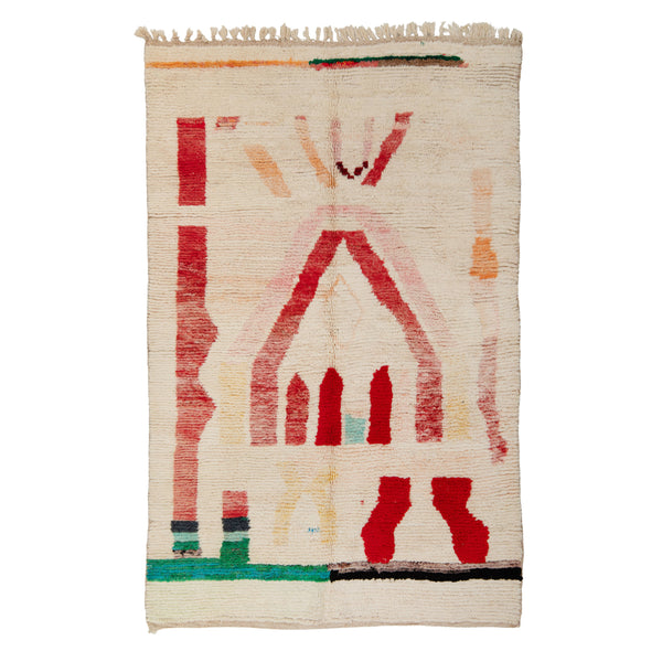 This Cream and Red Moroccan Berber Wool Rug - 5'9" x 9'2" is a striking piece with geometric shapes in red, orange, green and black. Hand-knotted in Morocco, it showcases artisanal craftsmanship and cultural significance for a truly one-of-a-kind piece.