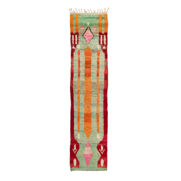 This Multicolored Moroccan Berber Wool Runner - 2'4" x 10' is a vibrant piece handcrafted in Morocco. Featuring a colorful geometric design in green, orange, cream and red, it's made from high-quality wool by expert artisans. This hand-knotted runner will add a touch of color and charm to any space.