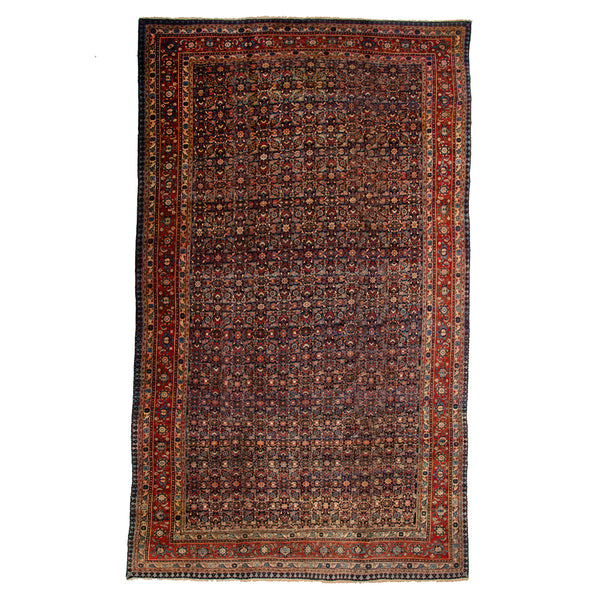 A 14 by 24-foot warm embrace in bold red, this traditional wool rug commands attention. Imagine it unrolling its grandeur across a spacious living area, staking its claim in a formal dining room, or asserting itself in a grand foyer. Each handmade knot tells a story of meticulous artistry passed down through generations, manifesting in a dense, rich pile that invites bare feet and withstands time's passage. The striking red border frames a symphony of patterns. Deep blues and maroons...