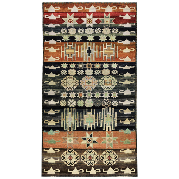 Enhance your space with the Multicolored Alchemy Traditional Wool Rug. This 5' x 9'4" hand-knotted rug from India features a stunning array of red, orange, gray, green, and white hues. The intricate geometric and symmetrical designs, including stars, crosses, and floral motifs, give it a traditional and artistic appearance. Made of high-quality wool, this rug exudes elegance and craftsmanship.