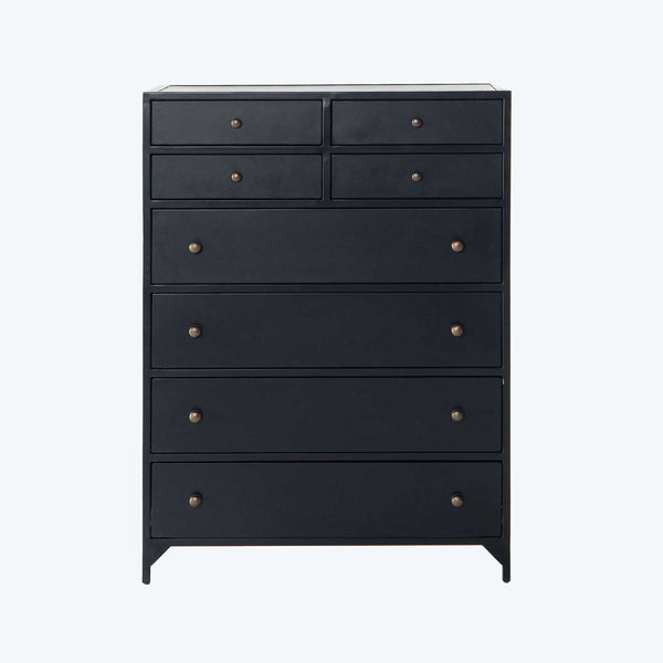 The Four Hands Metal Tall Dresser combines industrial charm with functional design, crafted from black iron with a deep onyx finish. Measuring 35.5" L x 19.75" D x 48" H and weighing 249 lb, this striking piece provides ample storage with four main drawers for larger items and four smaller top drawers for delicates and accessories. Accented with weathered bronze knob-style pulls, the dresser stands on slender legs with subtle angular accents that add to its contemporary appeal.Floor levelers ensure...