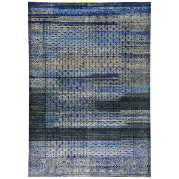 This Blue Alchemy Traditional Silk Wool Blend Rug measures 9' x 12'11", making it a suitable area rug for larger spaces. Part of the Alchemy Rug Collection, this hand-knotted piece originates from India, a country recognized for its rug-making heritage. The blend of silk and wool fibers contributes to both its soft texture and durability. The rug features an abstract design with a primary blue color palette. Varying shades of blue, from lighter tones to deep indigo, are presented in...