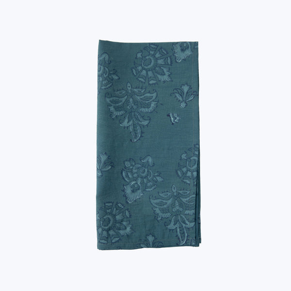 This 100% organic cotton napkin is produced by the special collaboration of 2 woman-owned artisan studios in India. The base fabric is first naturally dyed by Adiv Pure Nature using marigolds upcycled from temple offerings, then dyed Indigo. Tharangini Studio hand-block prints the patterns with organic ink using hand-carved blocks to create each individual piece.
