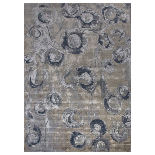 This Blue Contemporary Silk Wool Blend Rug - 8'11" x 12' features an abstract pattern with floral and circular motifs in shades of gray, black, and white. Hand-knotted in India, this high-quality rug has a textured appearance that complements modern interiors. Crafted from a luxurious silk wool blend, it exudes elegance and sophistication.