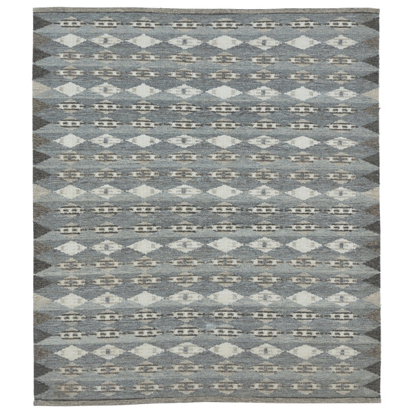This Blue Grey Swedish Inspired Dhurrie Wool rug, measuring 8' x 10', showcases a geometric pattern in shades of grey, blue, and white. Handwoven in India, this intricate design exudes a decorative and handcrafted charm. Made from high-quality wool, this rug offers a balanced and earthy color palette, adding a touch of elegance to your space.
