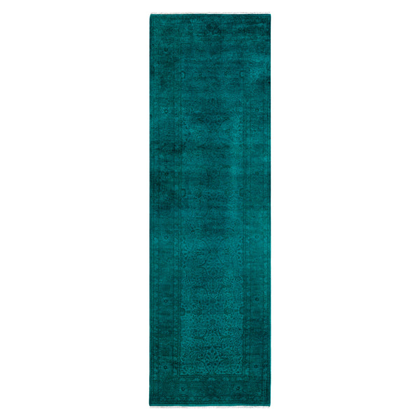 This 3' x 10' Blue Overdyed Wool Runner offers a blend of traditional craftsmanship and contemporary style. Crafted from durable wool, this hand-knotted rug originates from Pakistan. The runner features a deep blue hue achieved through an overdying process. This technique transforms an existing rug, typically with traditional patterns, by saturating it with a new color. The result is a solid, rich blue surface where the original intricate patterns are subtly visible as faded, ghosted designs beneath the new dye....