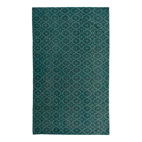 This Teal Overdyed Wool Rug measures 3 feet 10 inches by 8 feet, offering a distinctive floor covering option. As an overdyed rug, it features a uniform teal color while allowing its original geometric pattern to subtly show through, creating visual depth and a nuanced aesthetic. Crafted from 100% natural wool, this rug provides a soft texture underfoot and inherent durability. The hand-knotted construction, a reflection of traditional craftsmanship, originates from Pakistan, ensuring a unique and long-lasting piece. The rug...