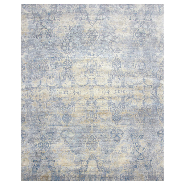 This Blue Traditional Silk Wool Blend Traditional rug from India features an intricate faded design with shades of gray, pale yellow, and beige. Hand Knotted at 9'1" x 12'1", this high-quality rug showcases a vintage aesthetic with a uniform pattern and expert craftsmanship.