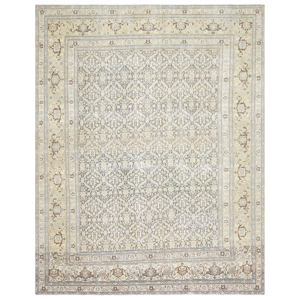 This Beige Vintage Antique Traditional Tabriz Wool Rug, measuring 9'1" x 11'5", is a masterpiece from Iran. Hand Knotted with 100% Wool, this elegant piece features symmetrical designs in muted tones of beige, cream, and light brown. The intricate diamond and floral motifs in the central area, surrounded by a border of geometric and floral elements, create a classic and sophisticated look for any interior.