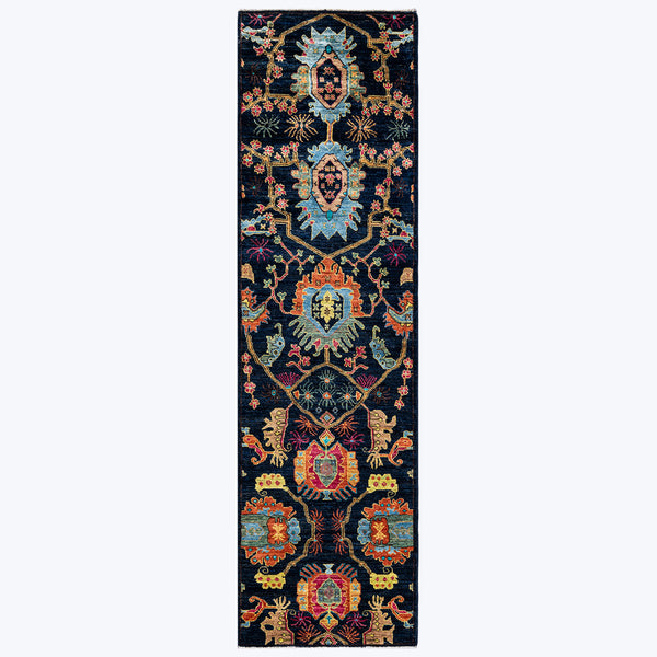 This Blue Traditional Wool Runner - 2' 7" x 9' 4" is a stunning piece from India. Hand-knotted from wool, it boasts a dark background adorned with intricate floral motifs in vibrant hues of orange, blue, and yellow. The stunning design and quality craftsmanship make it the perfect statement piece for any hallway.