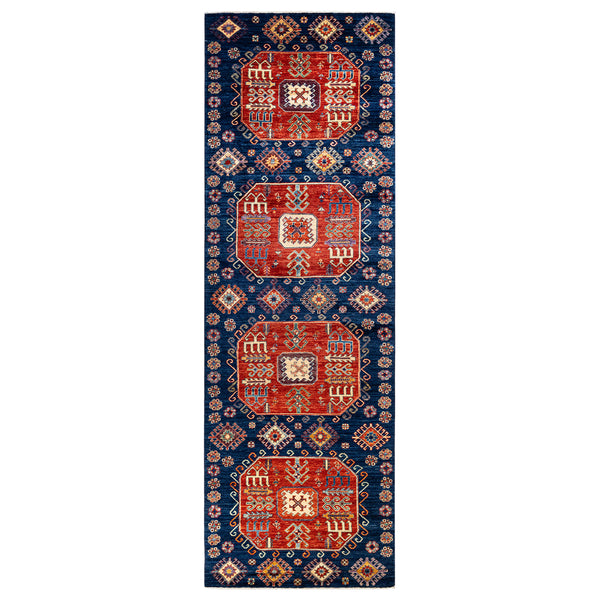 This Blue Traditional Wool Runner - 4' 1" x 13' 4" is a stunning piece from India. Hand-knotted from high-quality wool, it features a symmetrical pattern with intricate designs in shades of blue, red, beige, and white. Its fine details and craftsmanship make it a beautiful and high-end addition to any space.