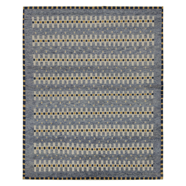 This Blue Transitional Swedish Inspired Wool Rug measures 8'1" x 9'11", offering a significant area for various room configurations. The design features a predominant blue-grey field, accented by a repeating geometric pattern. Horizontal bands composed of small, alternating rectangular shapes in off-white, light gold, and dark blue run across the rug's surface. A darker blue border, interspersed with thin gold lines, frames the entire piece, completing its structured appearance. The rug's style blends the clean lines of Swedish-inspired design with...