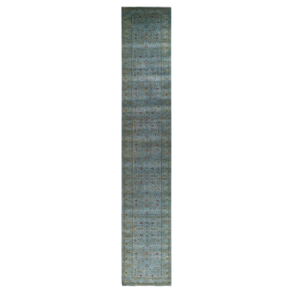 This Blue Overdyed Transitional Wool Runner - 2'7" x 15'8" epitomizes classic rug designs with a twist: a traditional pattern is overdyed in a brilliant blue color with hints of red and green. This hand-knotted runner rug is washed in a 100% natural botanical dye that reveals hidden nuances in the unique designs. This one-of-a-kind overdyed runner transcends trends, and its sturdy construction ensures that it’ll withstand years of heavy traffic. This blue runner is finished with a traditional fringe...