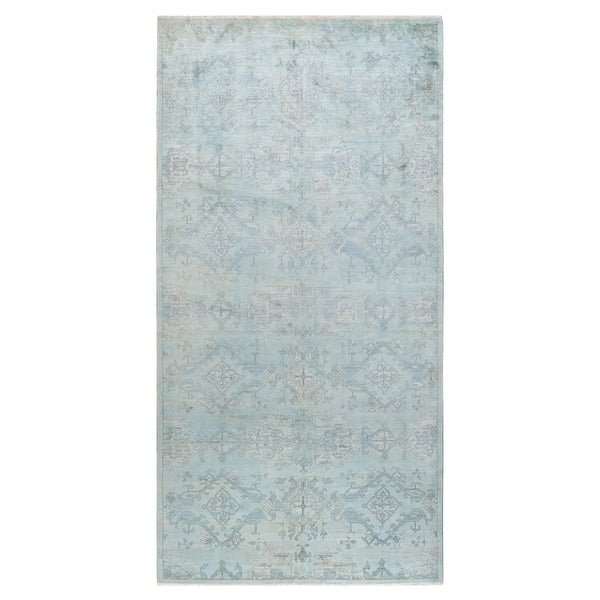 This Mint Blue Overdyed Wool Rug, measuring 6'2" x 12'2", blends traditional craftsmanship with a contemporary aesthetic. As an overdyed rug, it features a muted color palette over subtle, pre-existing patterns, offering a distressed yet refined appearance. Crafted from wool, this rug provides durability and a soft texture underfoot. Wool is a natural fiber known for its resilience and ability to withstand heavy foot traffic, making it suitable for various living spaces. The rug is hand-knotted, a traditional construction method...