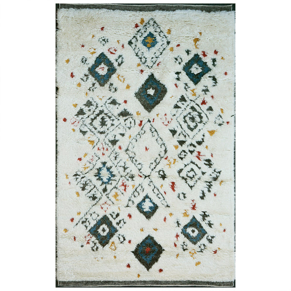 This Moroccan Style Rug - 6' x 9' showcases a stunning combination of colors and ivory tones, creating a stylish and inviting ambiance in any room. This modern Moroccan rug features a geometric tribal pattern crafted in a rich plush texture. Hand-knotted using the finest wool fibers, this contemporary Moroccan rug ensures exceptional quality and durability.