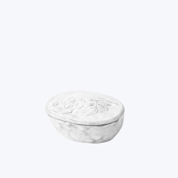 The delicate box with a sculpted rose lid is handmade by Parisian-based ceramic studio Astier de Villatte, emulating the elegance of simplicity in French 18th-century style ceramics. Handmade on the Rue St. Honore in Paris, these ceramics are crafted in a traditional pottery style passed down from generation to generation Ñ putting forth one-of-a-kind objects both romantically bohemian and practical in their everyday use. Hand molded from black terracotta, each piece from Astier de Villatte is finished in a milky-white...
