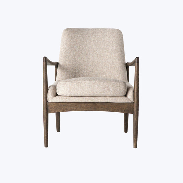 The Four Hands Braden Chair combines mid-century modern sophistication with deep comfort, featuring dramatic arms and a spacious 22.5" seat depth for ultimate relaxation. Offered in three fabrics, this chair is crafted from 100% high-quality polyester for durability and a soft touch. The 18" seat height and 24.5" arm height make it an inviting choice for lounging.ÊSet within a sculpted nettle wood frame, the Braden Chair exudes an architectural appeal, blending organic warmth with refined structure. This accent chair brings...