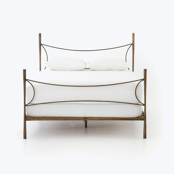 A sleek geometry is formed within the brass finish iron frame of this bed. Designed with the modern eye in bed, this iron bed offers a softer take on the classically straight silhouette of a metal framed bed. Sturdy with an airy feel.
