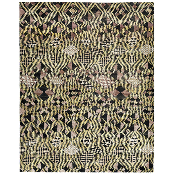 This Brown Alchemy Traditional Silk Wool Blend Rug - 8'1" x 10'5" showcases a captivating geometric pattern in black, white, brown, and beige. Hand knotted in India, this Traditional rug exudes a tribal charm with its intricate design. Crafted from luxurious Silk Wool Blend, it offers both exceptional quality and texture.